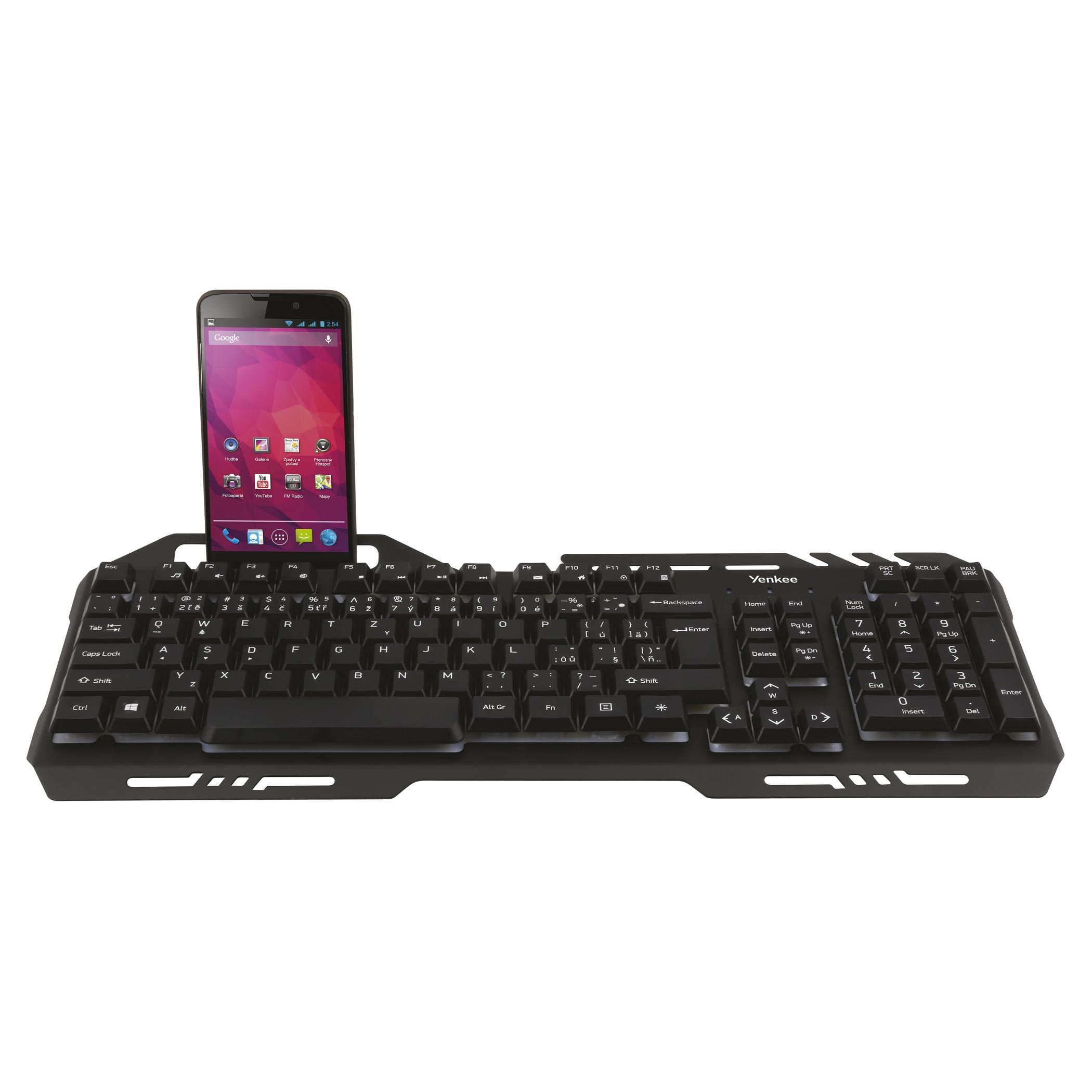 Odolné "rubber dome" klávesové spínače jsou konstruovány tak, aby zaručily rychlou odezvu a poskytly vám pocit, který je specifický pro mechanické klávesnice.Integrovaný držák telefonu