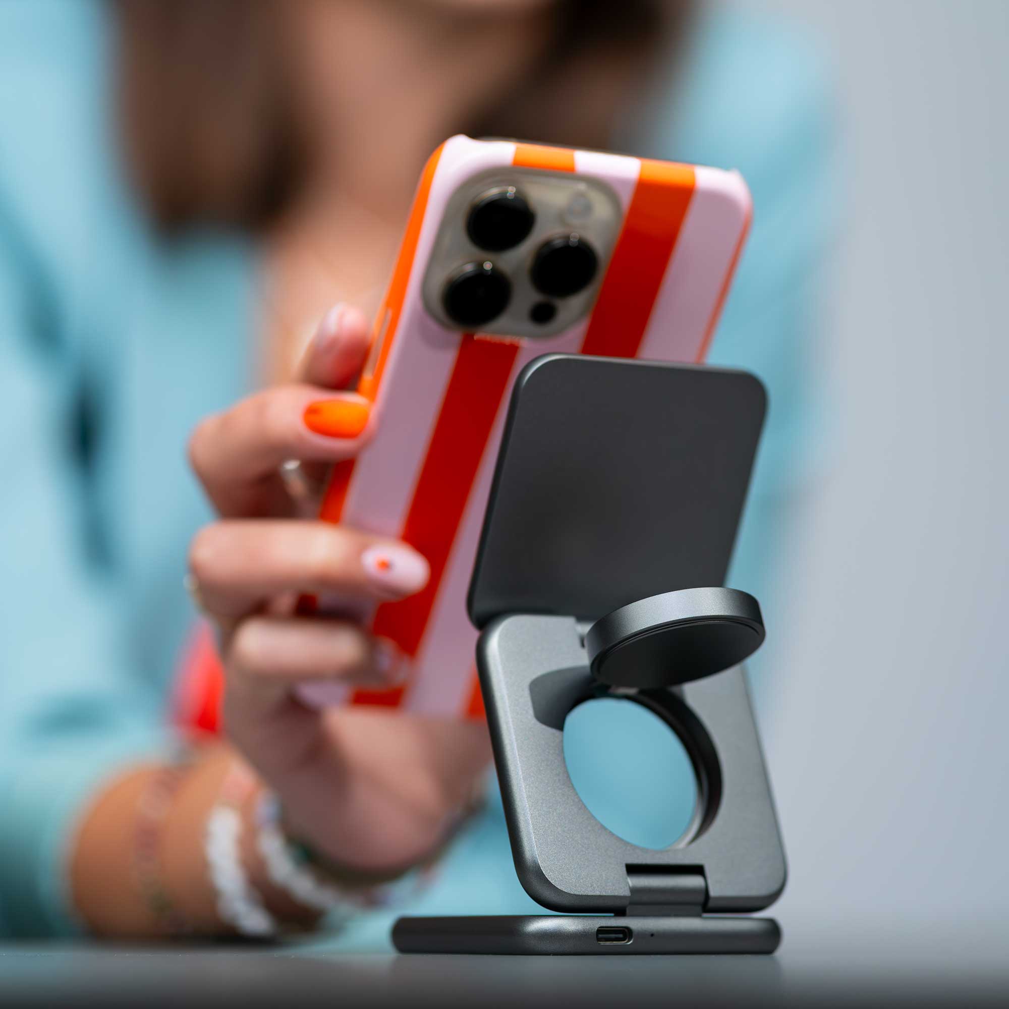 Nabíječka zároveň slouží jako funkční stojánek pro telefon. Díky nastavitelnému úhlu můžete pohodlně sledovat filmy, prohlížet zprávy nebo používat iPhone v režimu StandBy. Je to ideální řešení pro pracovní stůl, noční stolek nebo domácí kancelář – přehledné, minimalistické a praktické.Kompaktní design ideální na cesty