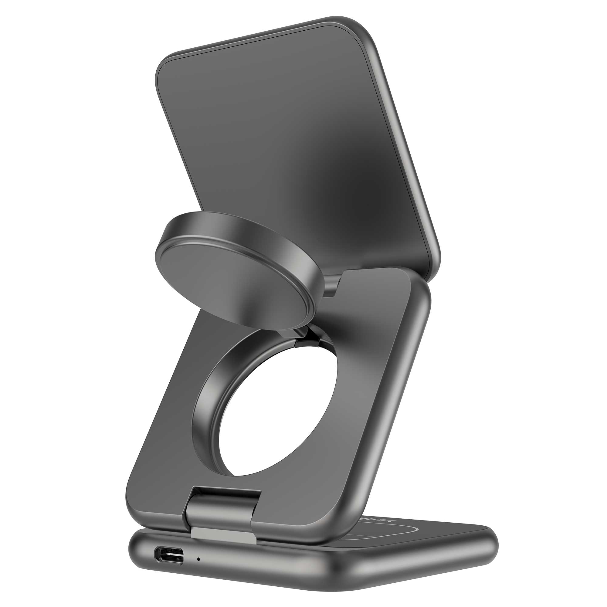 Speciální magnetické rameno je určeno pro Apple Watch – stačí hodinky přiložit a magnet je automaticky přichytí na správné místo. Nabíjení se spustí okamžitě, bez nutnosti nastavování nebo hledání správného úhlu. Samostatná nabíjecí plocha pro bezdrátová sluchátka zajistí, že všechna vaše zařízení budou připravena k použití současně.Elegantní stojánek a nastavitelný úhel