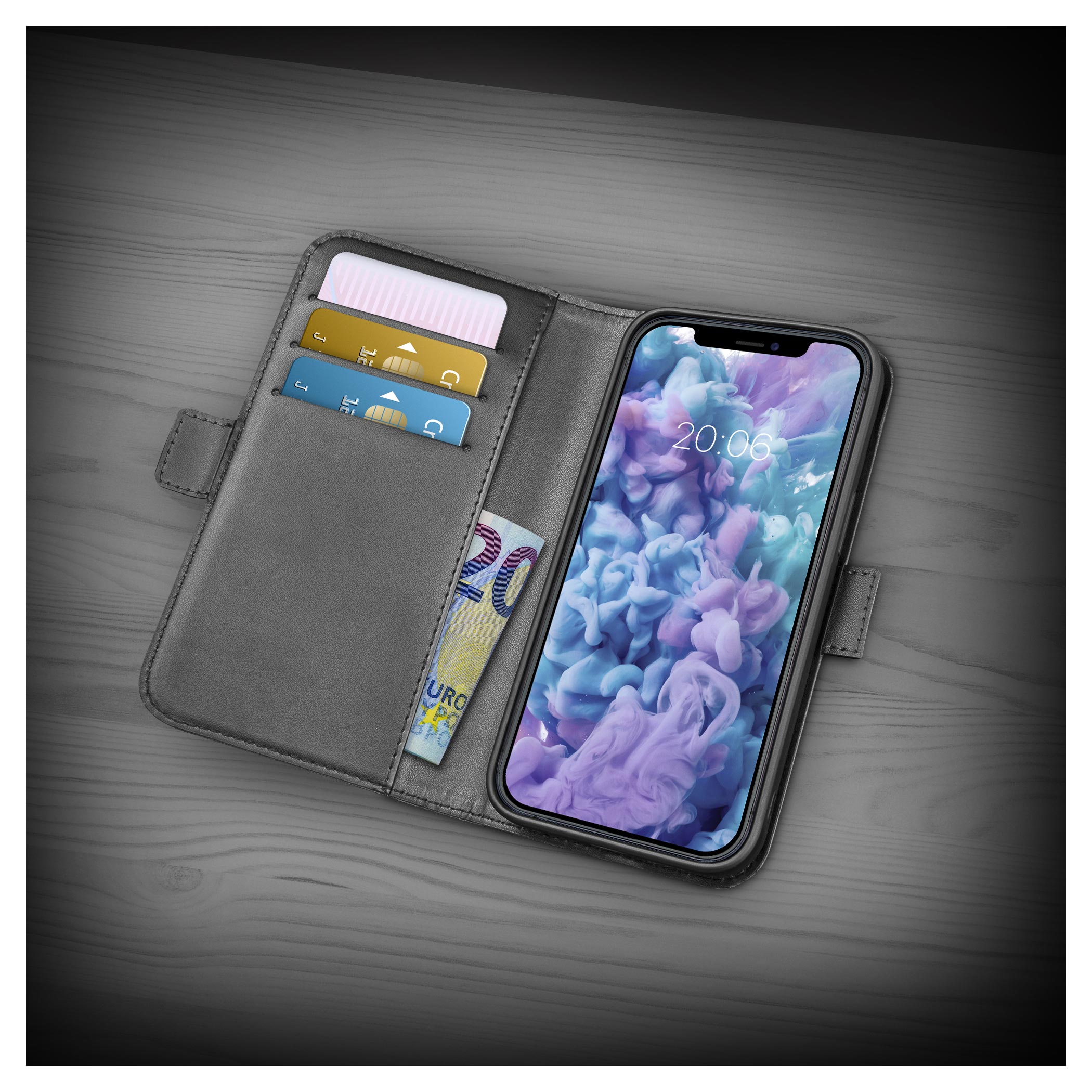 Elegantní kožený design evokující peněženku díky zabudovaným přihrádkám na karty a jedné velké kapse na bankovky.Silikonová vnitřní výstelka