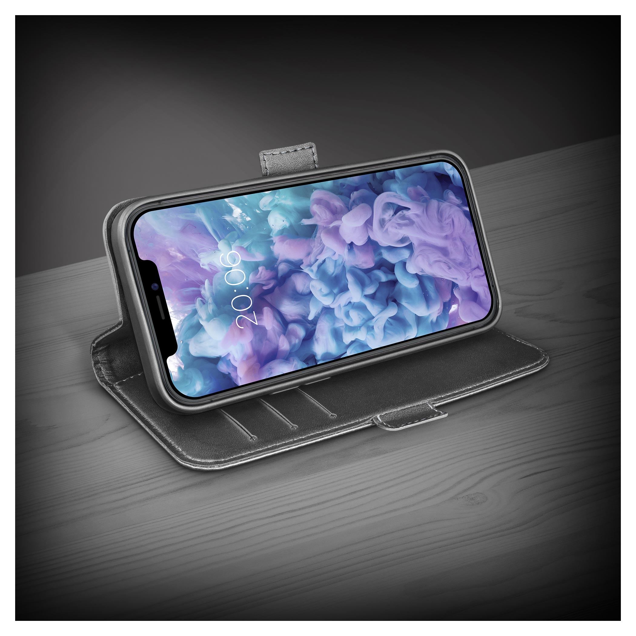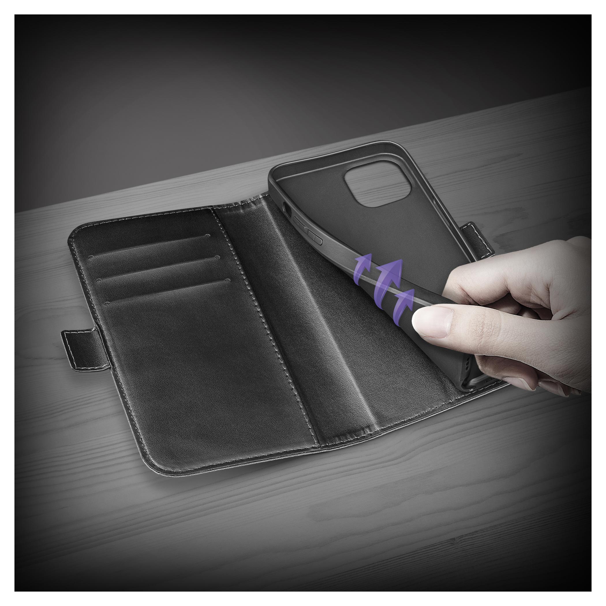 Elegantní kožený design evokující peněženku díky zabudovaným přihrádkám na karty a jedné velké kapse na bankovky.Silikonová vnitřní výstelka
