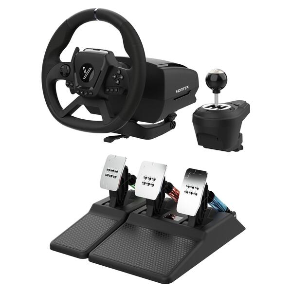VORTEX je závodní volant, který vám přinese skutečný pocit řízení – s autentickým force feedbackem, kovovými pedály, H‑řadicí pákou a precizním uchycením na stůl. Díky texturovanému povrchu, možnosti úprav v mobilní aplikaci a maximálnímu rejdu 1080° nabízí kontrolu, stabilitu i naprosté ponoření do každého závodu.